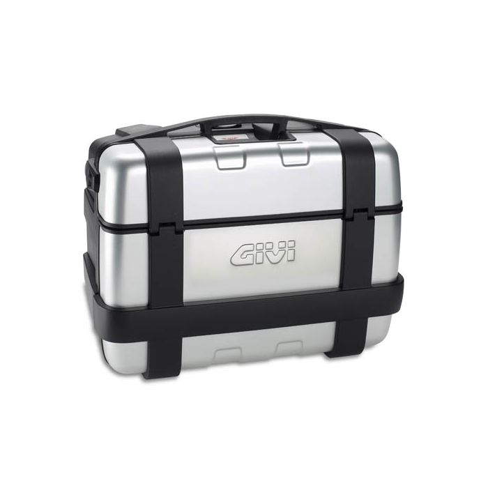 Valigia 46 Lt con finitura in alluminio dotata di sportello di apertura superiore, della linea monokey che permette l'apertura della valigia e la sua rimozione dalla piastra di fissaggio, tramite l'utilizzo di una sola chiave. Ha un volume di 46 lt,un carico massimo di 10 Kg. Dimensioni l=526mm , p=310mm , h=411mm. Disponibili in due versioni con capienza di 46litri (TRK46N) e 33litri (TRK33N), le nuove TREKKER sono la soluzione ideale per le moto dotate di terminale di scarico solo su un lato; montando infatti la valigia più piccola sul lato dove è presente la marmitta e la grande dall'altro lato, in molti casi si risolve il problema dell'asimmetria che si otterrebbe con delle tradizionali valigie laterali. Grazie a dei selettori situati all'interno delle valigie, su entrambe le versioni è possibile decidere se aprire l'intero coperchio, o il solo sportellino superiore (molto pratico per introdurre o estrarre degli oggetti dalla valigia durante il viaggio evitando di ribaltare l'intero bagaglio). Impreziosite da una pregiata lamina in vero alluminio anodizzato, tali valigie sono particolarmente indicate non solo per le enduro stradali, ma anche per le più eleganti moto turistiche. La particolarità di essere vendute in confezione singola, e di essere utilizzate come bauletto top case sulle piastre Monokey, permette al cliente di scegliere la combinazione che più riesce a soddisfare le sue esigenze di spazio, decidendo quali versioni montare sulla propria moto.